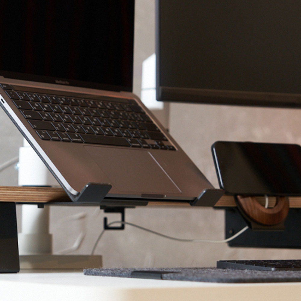 #2 小配件:手機架、MagSafe手機架、平板電腦架、收線扣環,在85及116公分桌板都能4款同時安裝。