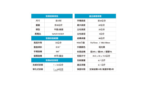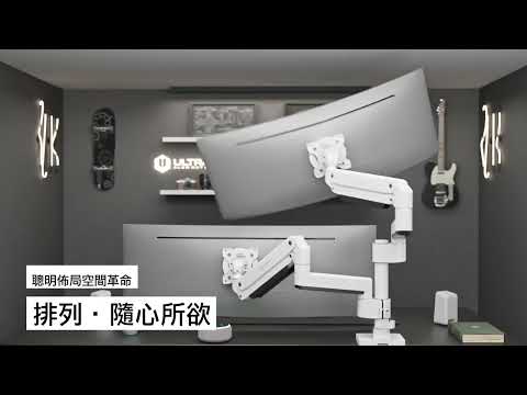 三螢幕支架,支援三螢幕上下及左右排列,三螢幕支架懸臂大幅節省桌面空間。讓螢幕按照你的任務需求排列,打造高度個人化、寬敞、整潔且富有效率的電腦工作站。